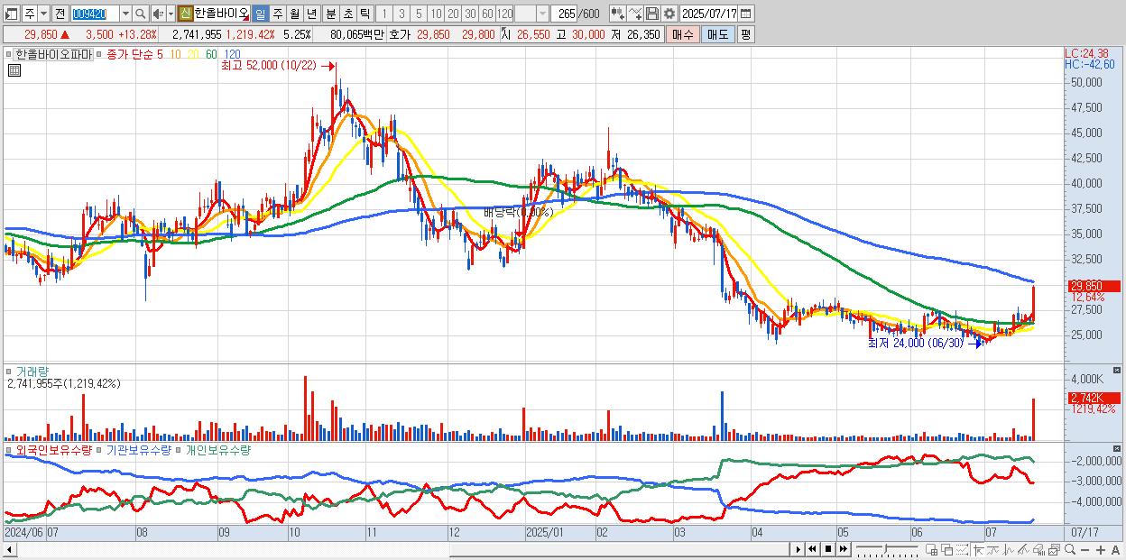 - 한올바이오파마 (29,900원 ▲ 13.47% , 시총: 15,620억, 거래량: 1,669,406, 거래대금:487억)