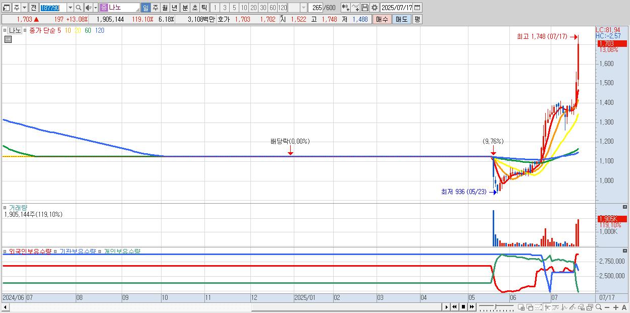 - 나노 (1,703원 ▲ 13.08% , 시총: 525억, 거래량: 1,905,144, 거래대금:31억)