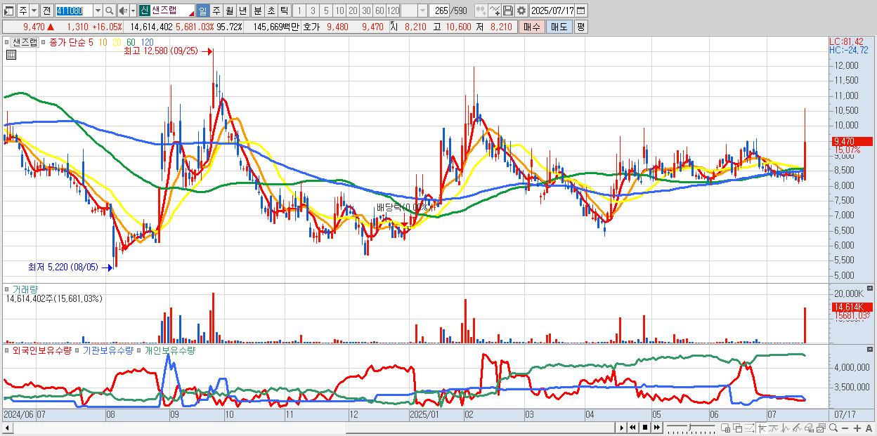 - 샌즈랩 (9,530원 ▲ 16.79% , 시총: 1,455억, 거래량: 6,540,172, 거래대금:662억)