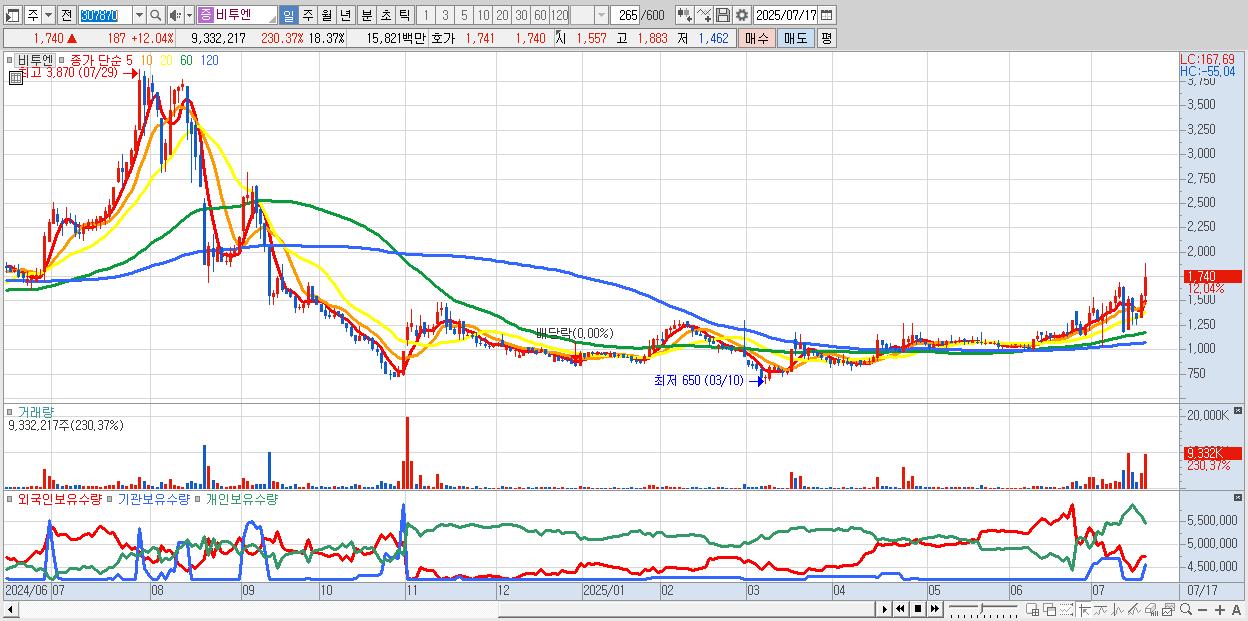 - 비투엔 (1,740원 ▲ 12.04% , 시총: 884억, 거래량: 9,332,217, 거래대금:158억)