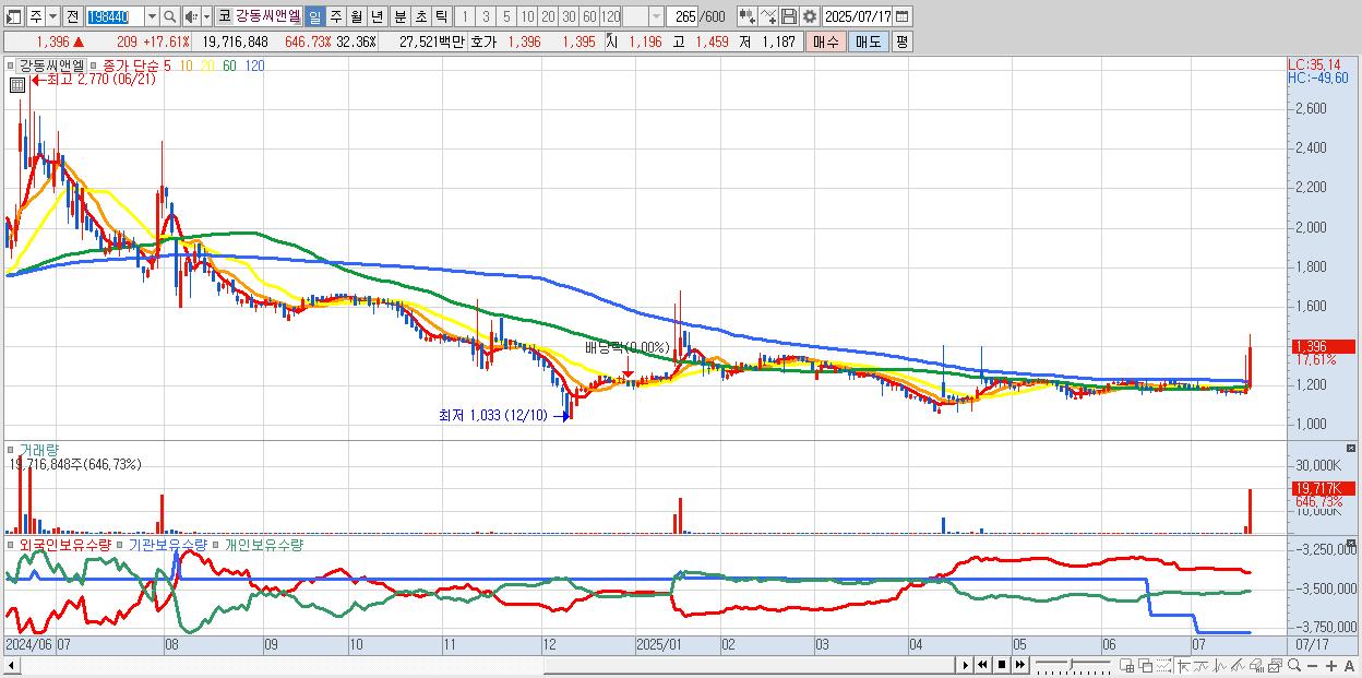 - 강동씨앤엘 (1,396원 ▲ 17.61% , 시총: 851억, 거래량: 19,716,848, 거래대금:275억)