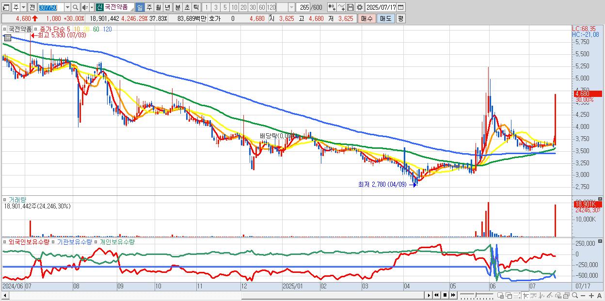 - 국전약품 (4,680원 ▲ 30% , 시총: 2,338억, 거래량: 18,901,442, 거래대금:837억)