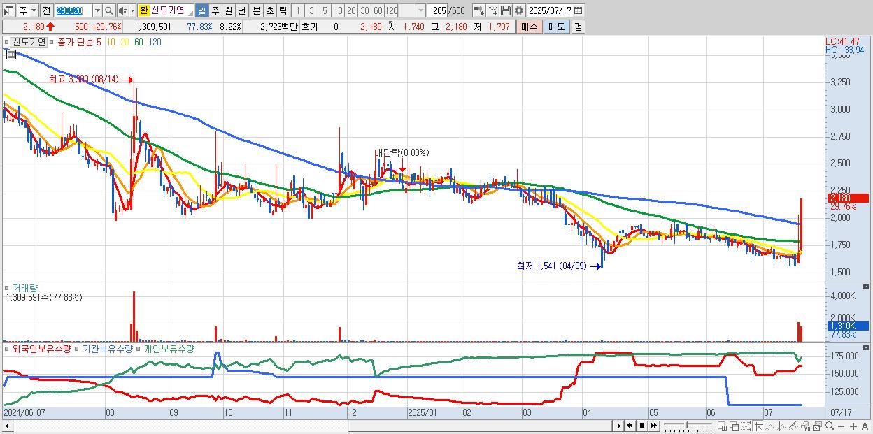 - 신도기연 (2,180원 ▲ 29.76% , 시총: 347억, 거래량: 1,309,591, 거래대금:27억)