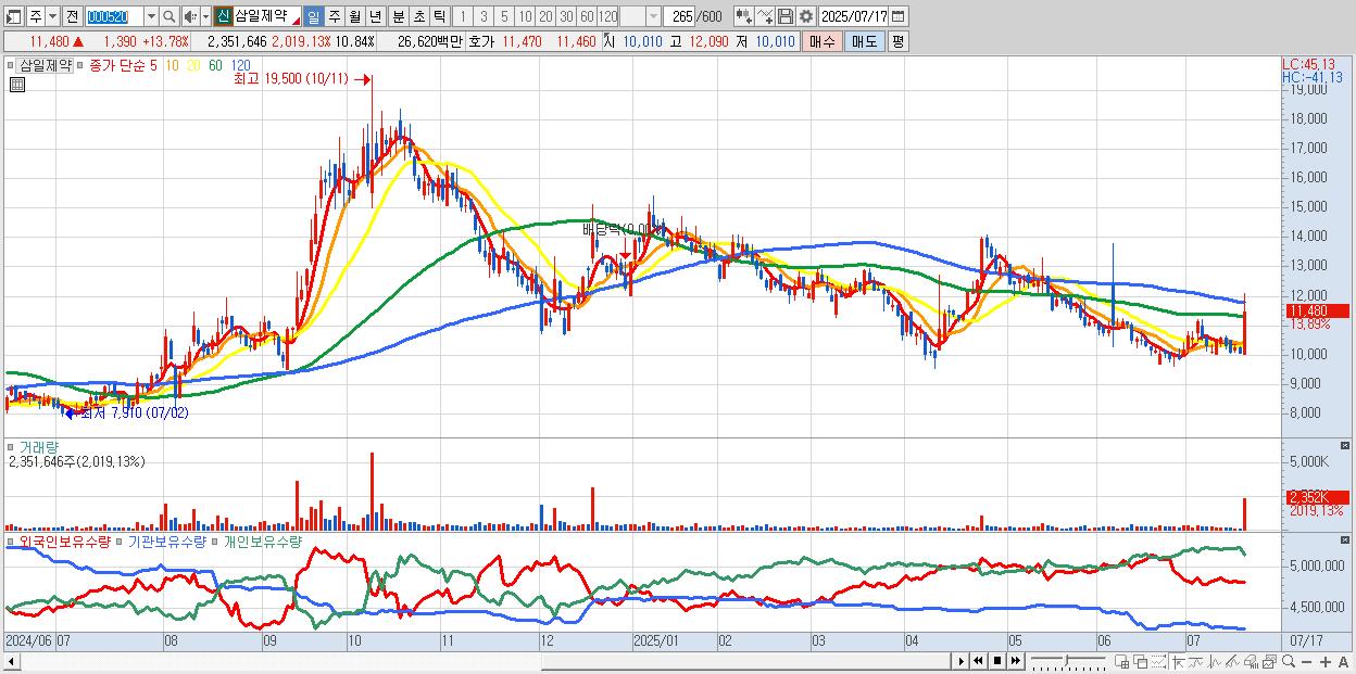 - 삼일제약 (11,190원 ▲ 10.9% , 시총: 2,427억, 거래량: 934,708, 거래대금:103억)