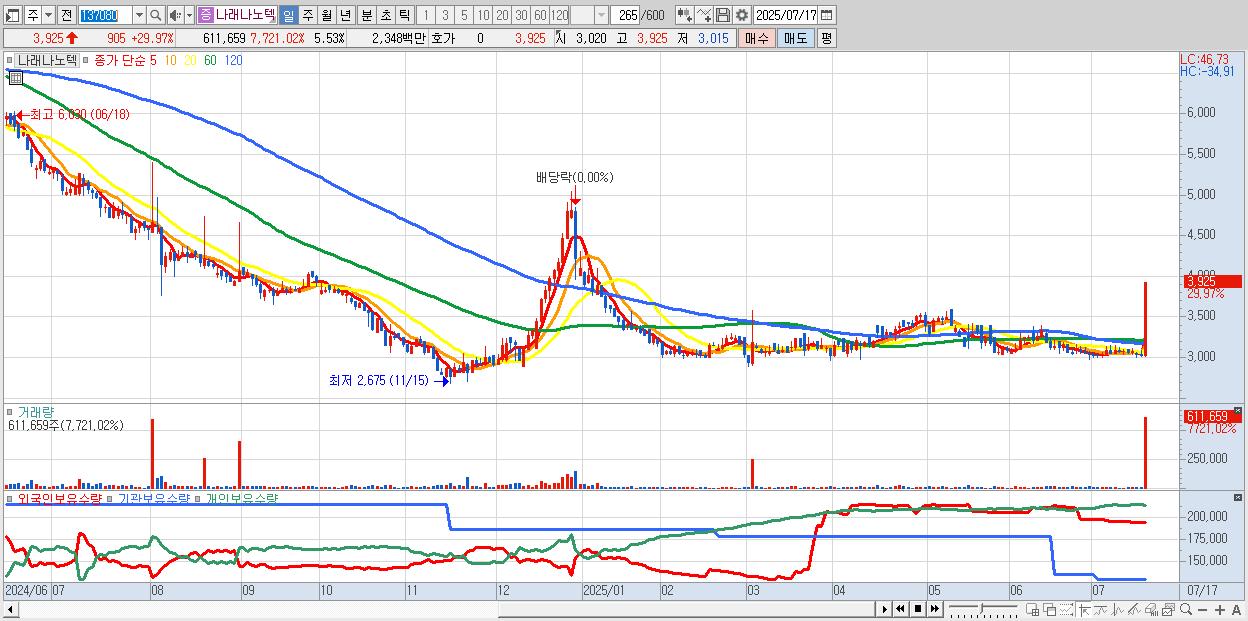 - 나래나노텍 (3,925원 ▲ 29.97% , 시총: 434억, 거래량: 611,659, 거래대금:23억)