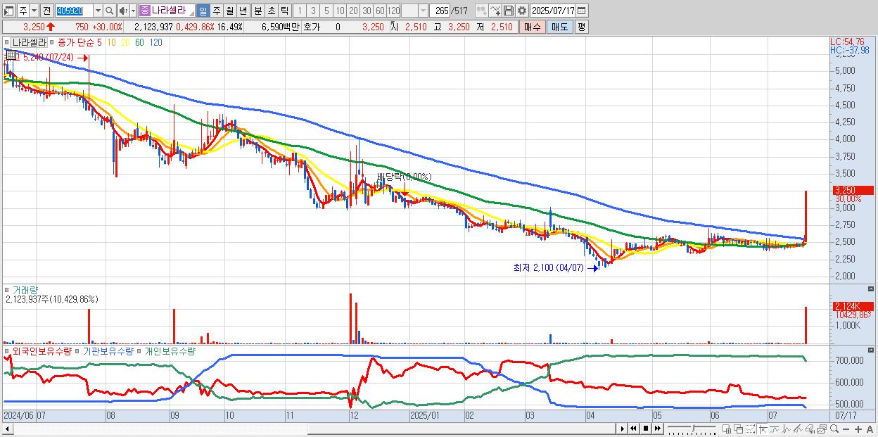 2.나라셀라 3,250원 ▲ 30% (KOSDAQ, 405920)