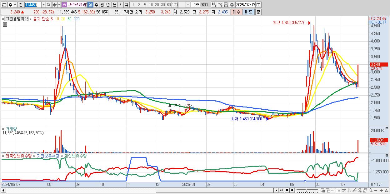 - 그린생명과학 (3,240원 ▲ 28.57% , 시총: 648억, 거래량: 11,369,446, 거래대금:351억)