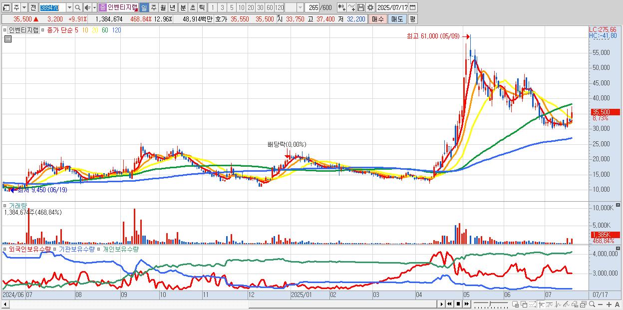 - 인벤티지랩 (35,650원 ▲ 10.37% , 시총: 3,809억, 거래량: 784,898, 거래대금:277억)