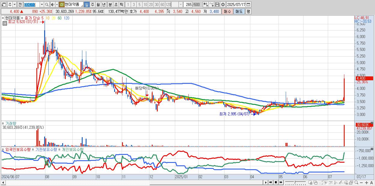 - 현대약품 (4,400원 ▲ 25.36% , 시총: 1,408억, 거래량: 30,603,269, 거래대금:1,305억)