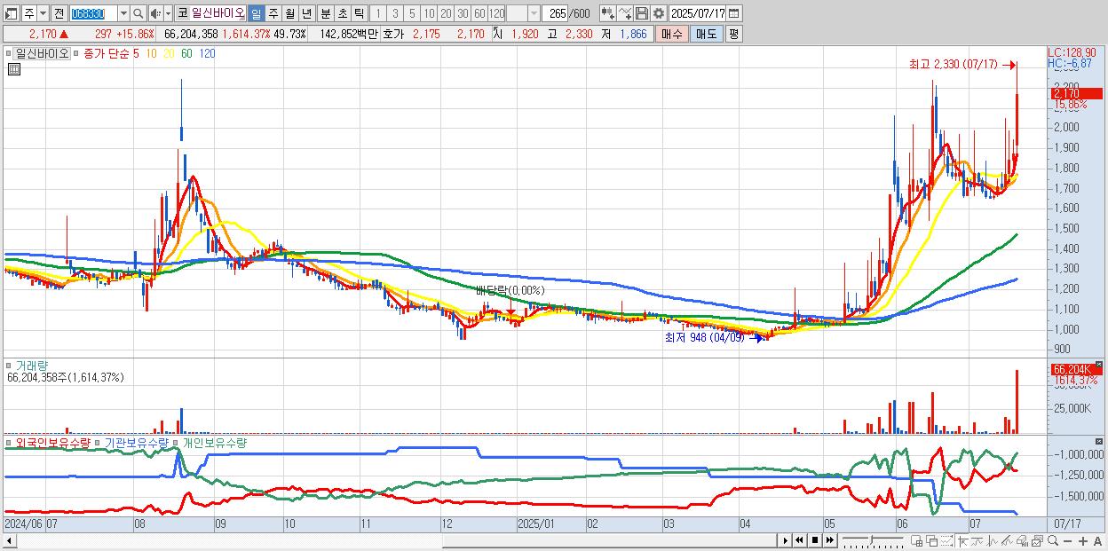 - 일신바이오 (2,170원 ▲ 15.86% , 시총: 959억, 거래량: 66,204,358, 거래대금:1,429억)