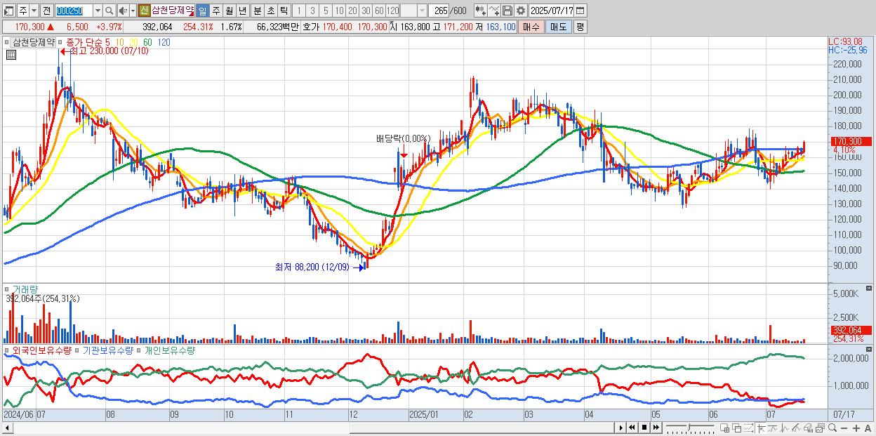 - 삼천당제약 (170,300원 ▲ 3.97% , 시총: 39,948억, 외국인 순매수 거래금:83억)