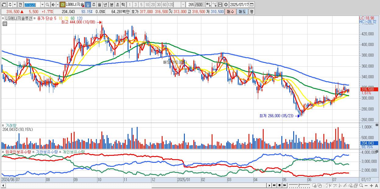 - LG에너지솔루션 (317,000원 ▲ 1.93% , 시총: 741,780억, 외국인 순매수 거래금:98억)
