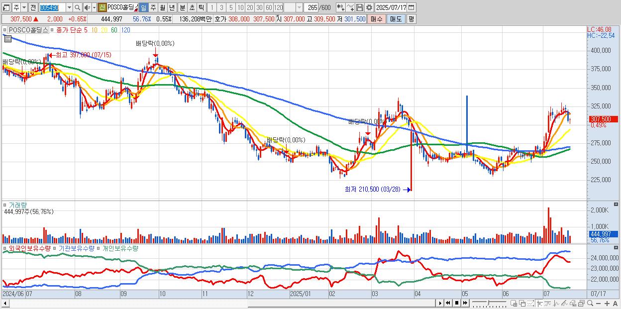 - POSCO홀딩스 (307,500원 ▲ 0.65% , 시총: 248,869억, 외국인 순매수 거래금:93억)