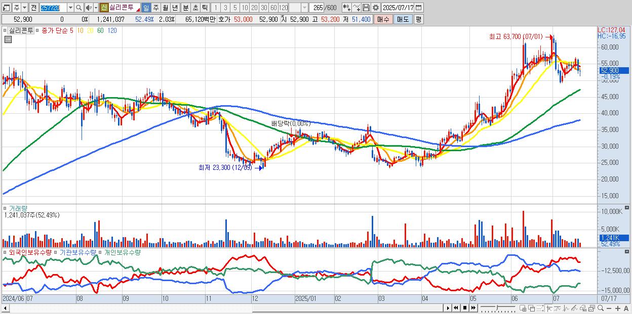 - 실리콘투 (52,800원 ▼ -0.19% , 시총: 32,299억, 외국인 순매수 거래금:67억)