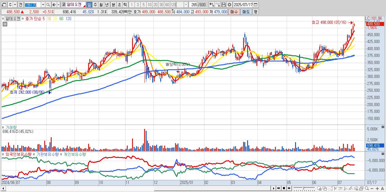 - 알테오젠 (488,500원 ▲ 0.51% , 시총: 261,176억, 외국인 순매수 거래금:58억)