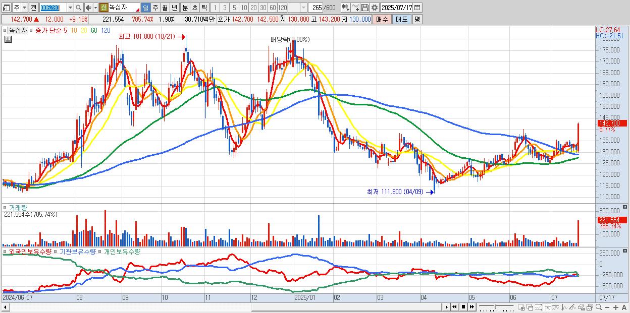 - 녹십자 (142,800원 ▲ 9.26% , 시총: 16,688억, 외국인 순매수 거래금:83억)