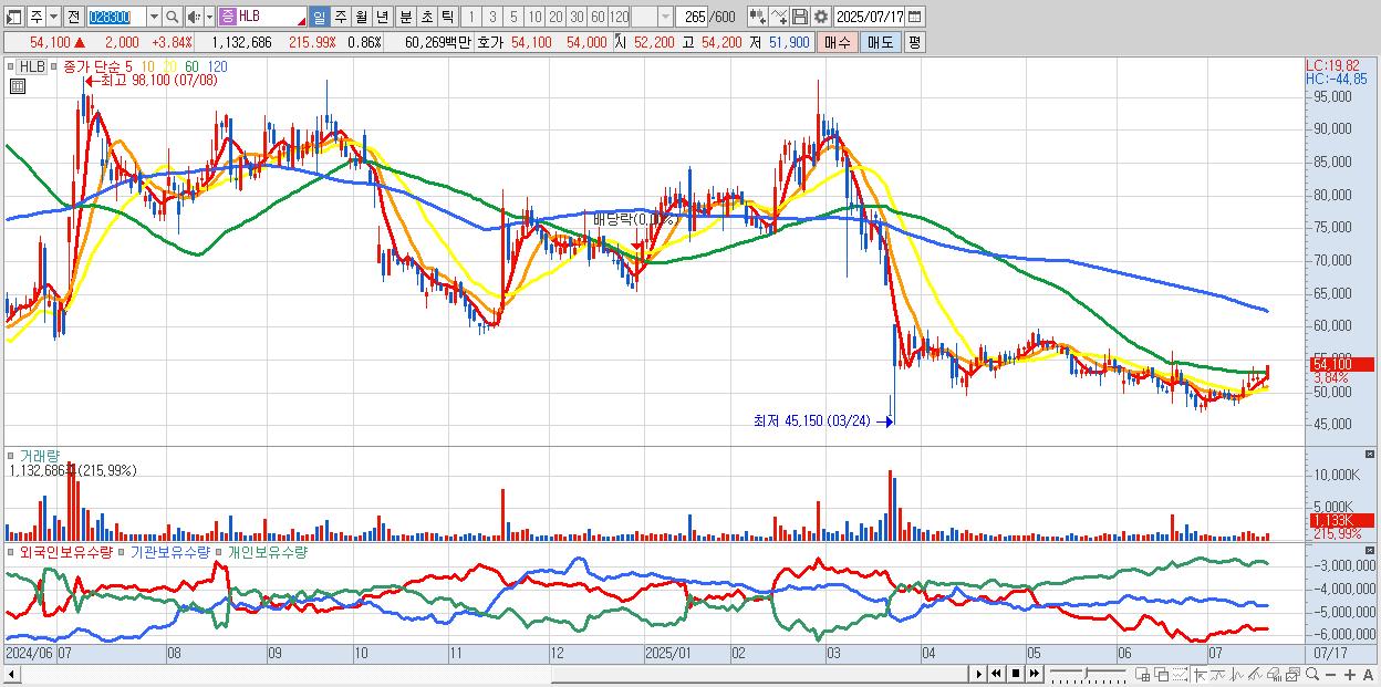 - HLB (54,000원 ▲ 3.65% , 시총: 70,972억, 외국인 순매수 거래금:67억)
