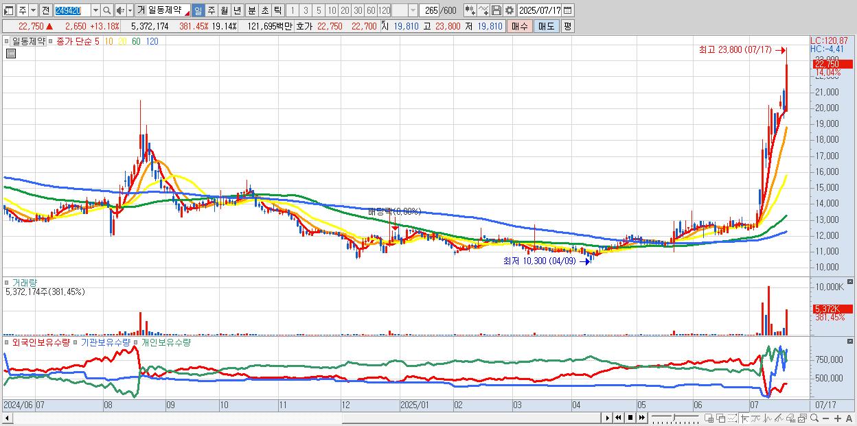 - 일동제약 (22,800원 ▲ 13.43% , 시총: 6,398억, 외국인 순매수 거래금:61억)