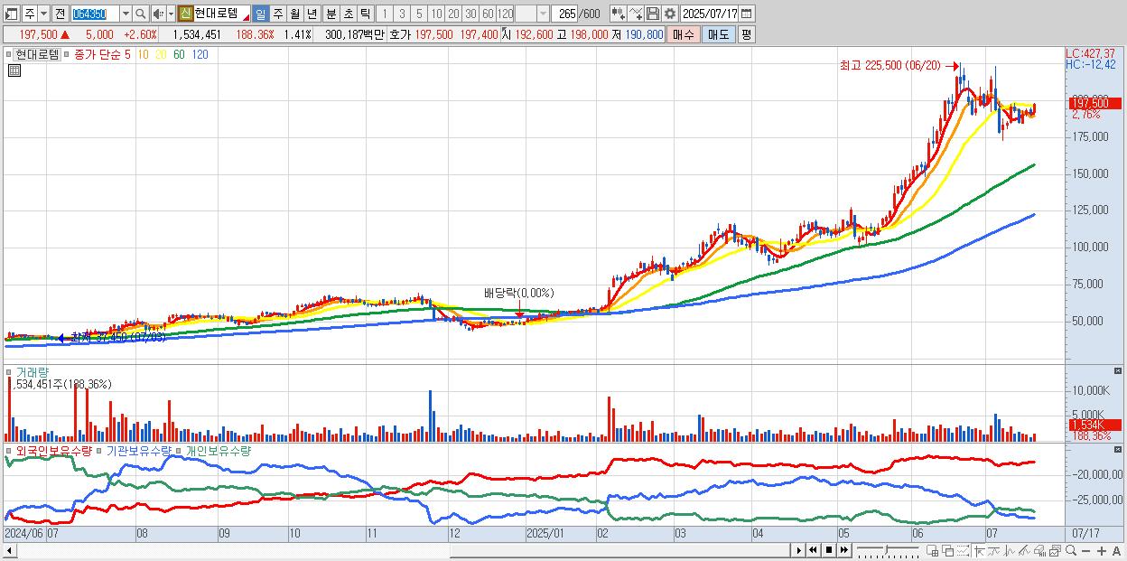 - 현대로템 (197,600원 ▲ 2.65% , 시총: 215,665억, 외국인 순매수 거래금:450억)