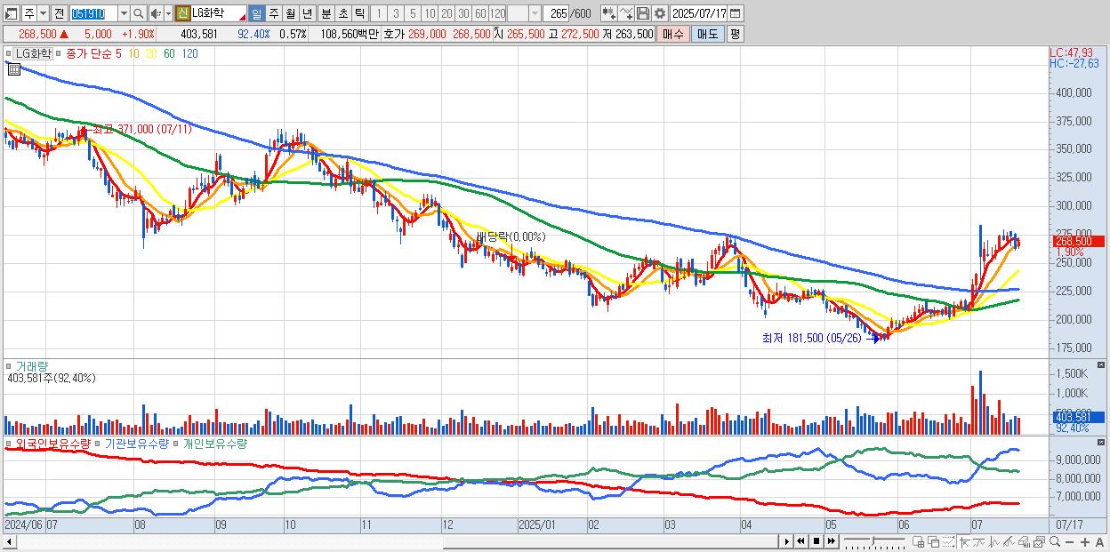 - LG화학 (269,500원 ▲ 2.28% , 시총: 190,246억, 외국인 순매수 거래금:149억)