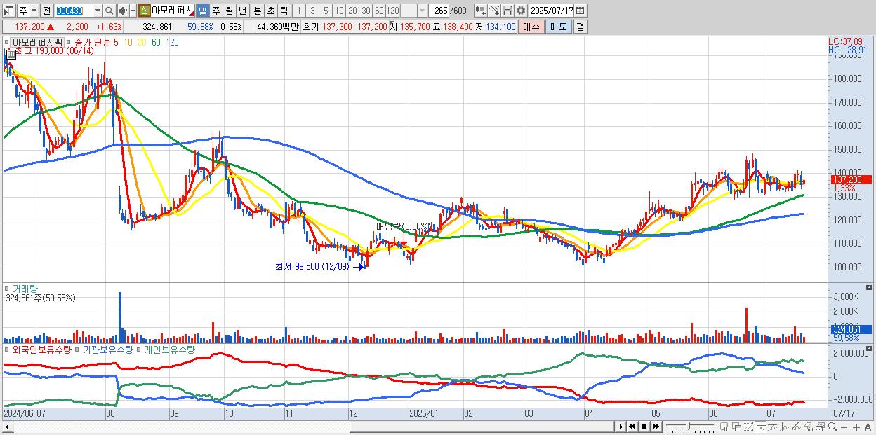 - 아모레퍼시픽 (137,700원 ▲ 2% , 시총: 80,545억, 외국인 순매수 거래금:78억)