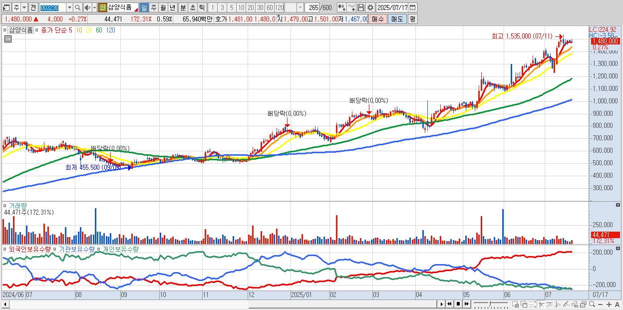- 삼양식품 (1,484,000원 ▲ 0.54% , 시총: 111,790억, 외국인 순매수 거래금:148억)
