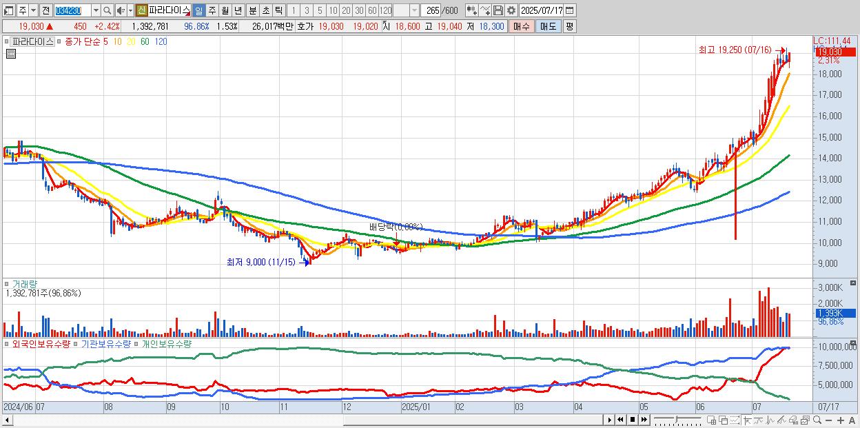 30.파라다이스 18,950원 ▲ 1.99% (KOSPI, 034230)