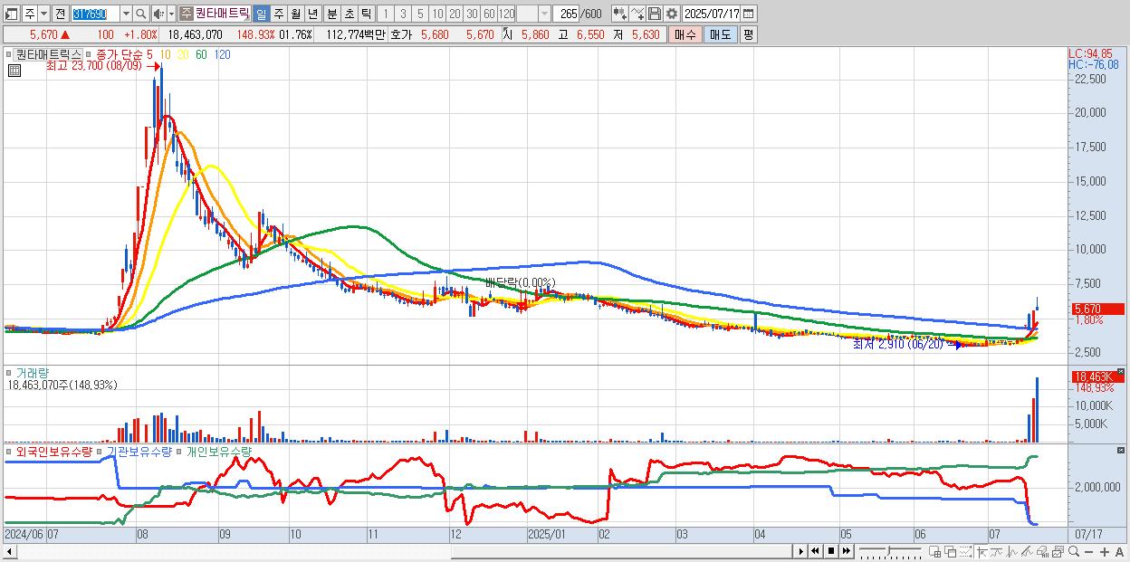 - 퀀타매트릭스 (5,670원 ▲ 1.8% , 시총: 1,029억, 거래량: 18,463,070, 거래대금:1,128억)