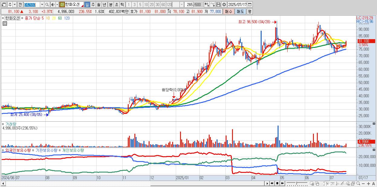 - 한화오션 (80,700원 ▲ 3.46% , 시총: 247,276억, 거래량: 2,879,405, 거래대금:2,323억)