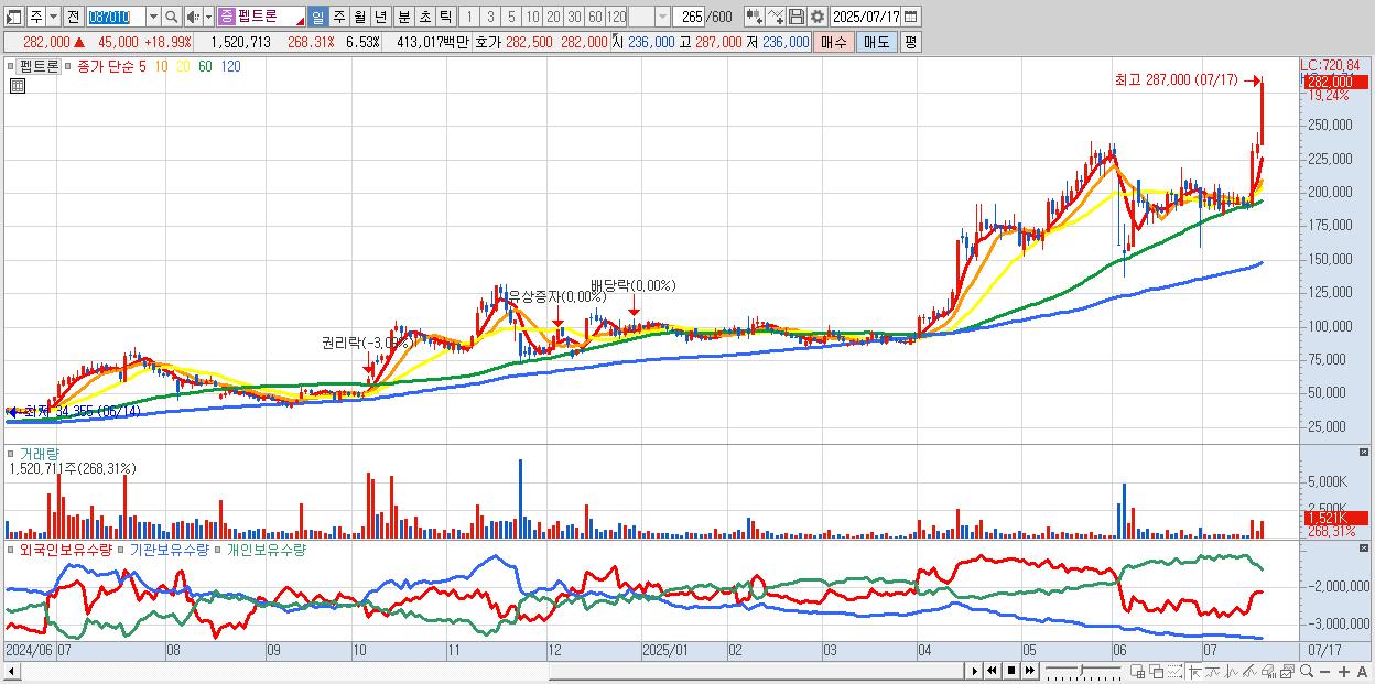 - 펩트론 (283,500원 ▲ 19.62% , 시총: 66,048억, 거래량: 885,490, 거래대금:2,410억)