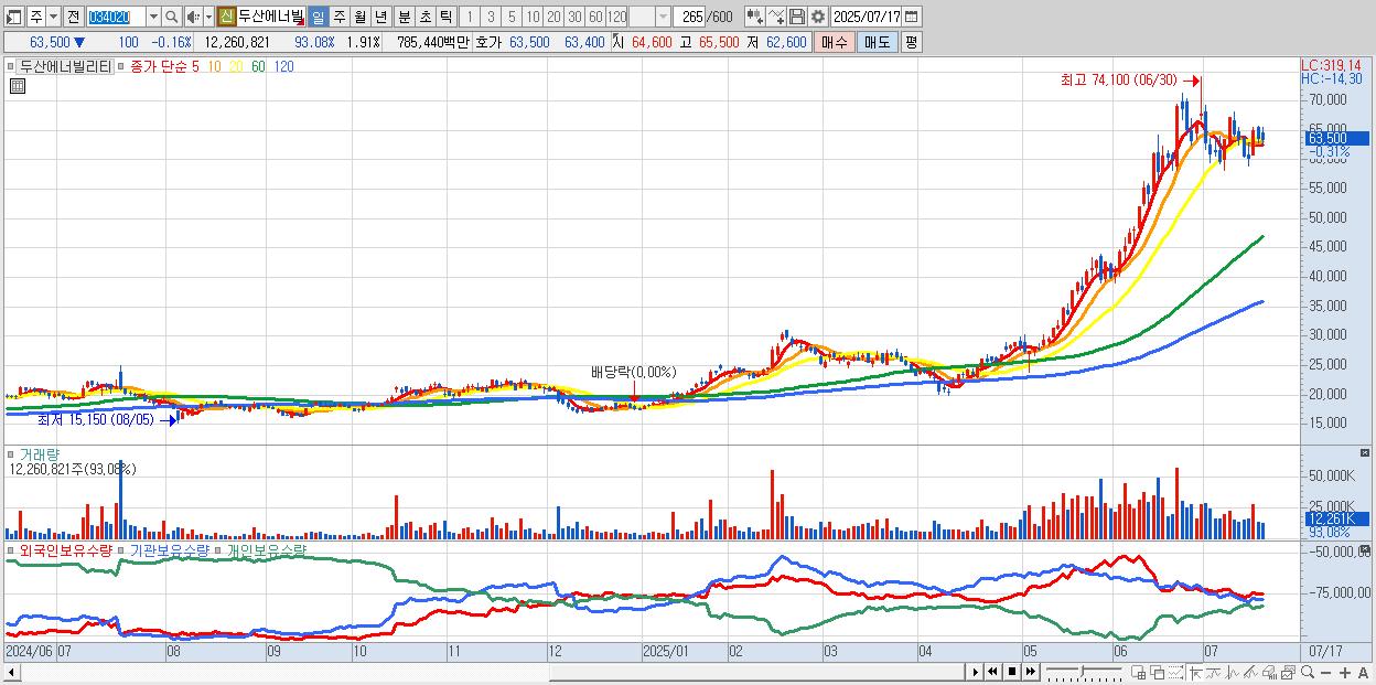 - 두산에너빌리티 (63,300원 ▼ -0.47% , 시총: 405,475억, 거래량: 5,721,579, 거래대금:3,661억)