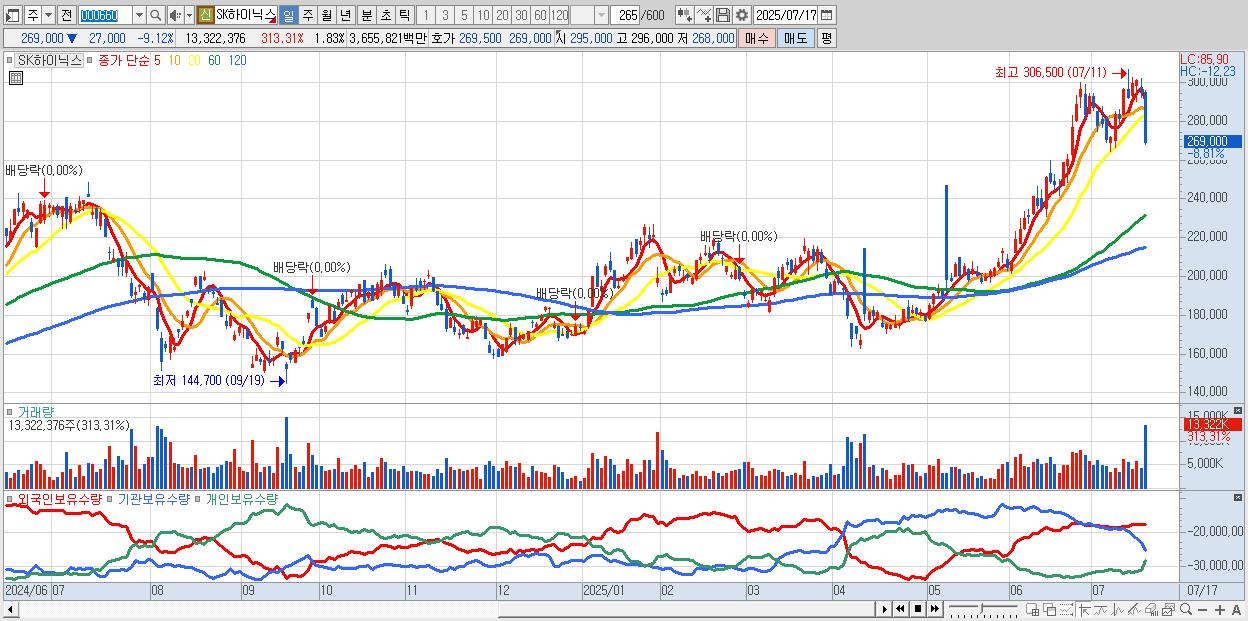 - SK하이닉스 (269,500원 ▼ -8.95% , 시총: 1,961,966억, 거래량: 9,328,322, 거래대금:25,580억)