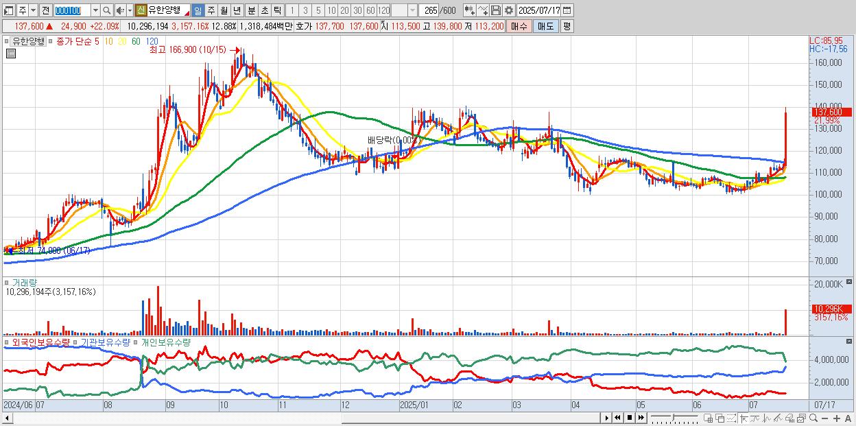 - 유한양행 (135,800원 ▲ 20.5% , 시총: 108,597억, 거래량: 5,178,462, 거래대금:6,558억)