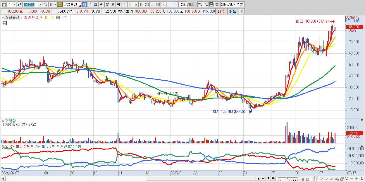 - 삼성물산 (184,400원 ▲ 1.65% , 시총: 313,437억, 거래량: 895,329, 거래대금:1,637억)