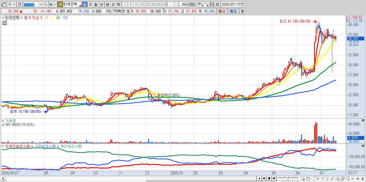 - 한국전력 (36,500원 0% , 시총: 234,317억, 거래량: 2,874,588, 거래대금:1,046억)