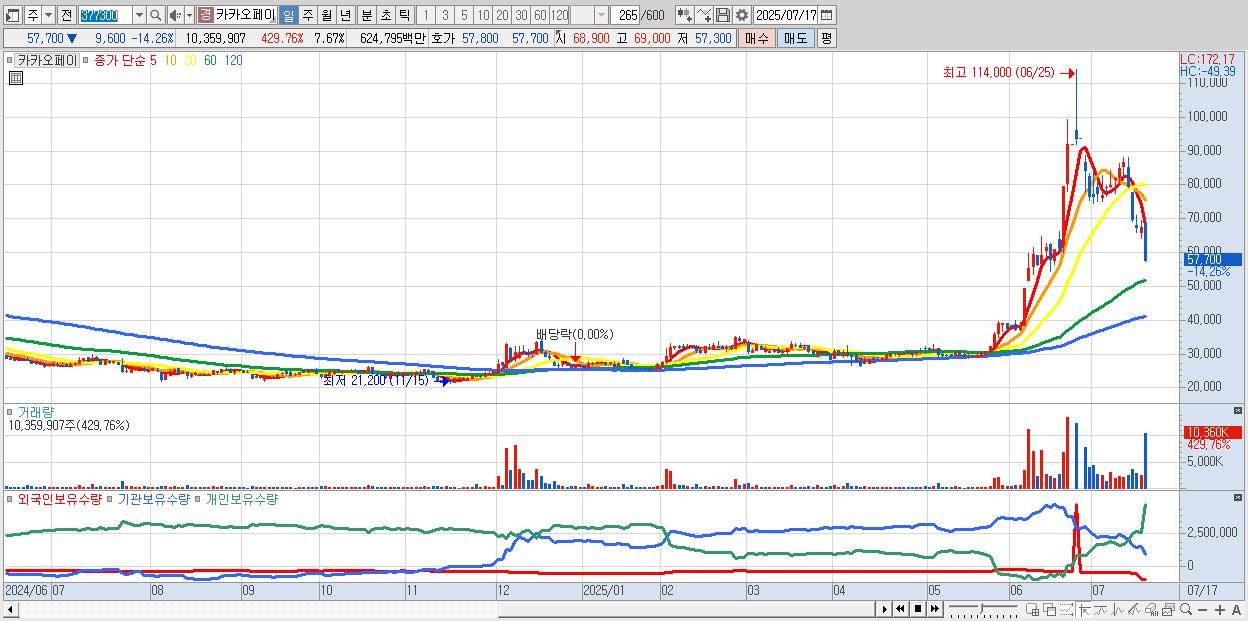 - 카카오페이 (57,700원 ▼ -14.26% , 시총: 77,890억, 거래량: 10,359,907, 거래대금:6,248억)