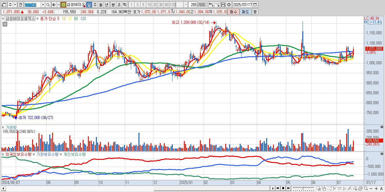 - 삼성바이오로직스 (1,070,000원 ▲ 3.58% , 시총: 761,562억, 거래량: 106,309, 거래대금:1,128억)