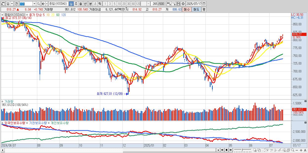 | 07/17 | 818.27 | ▲0.74% | 592억 | -714억 | 32억 | 90억 |