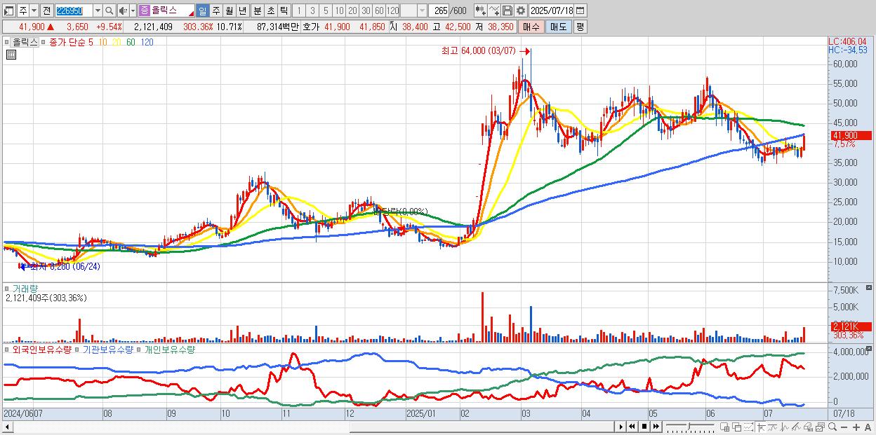- 올릭스 (42,000원 ▲ 9.8% , 시총: 8,316억, 거래량: 1,291,006, 거래대금:532억)