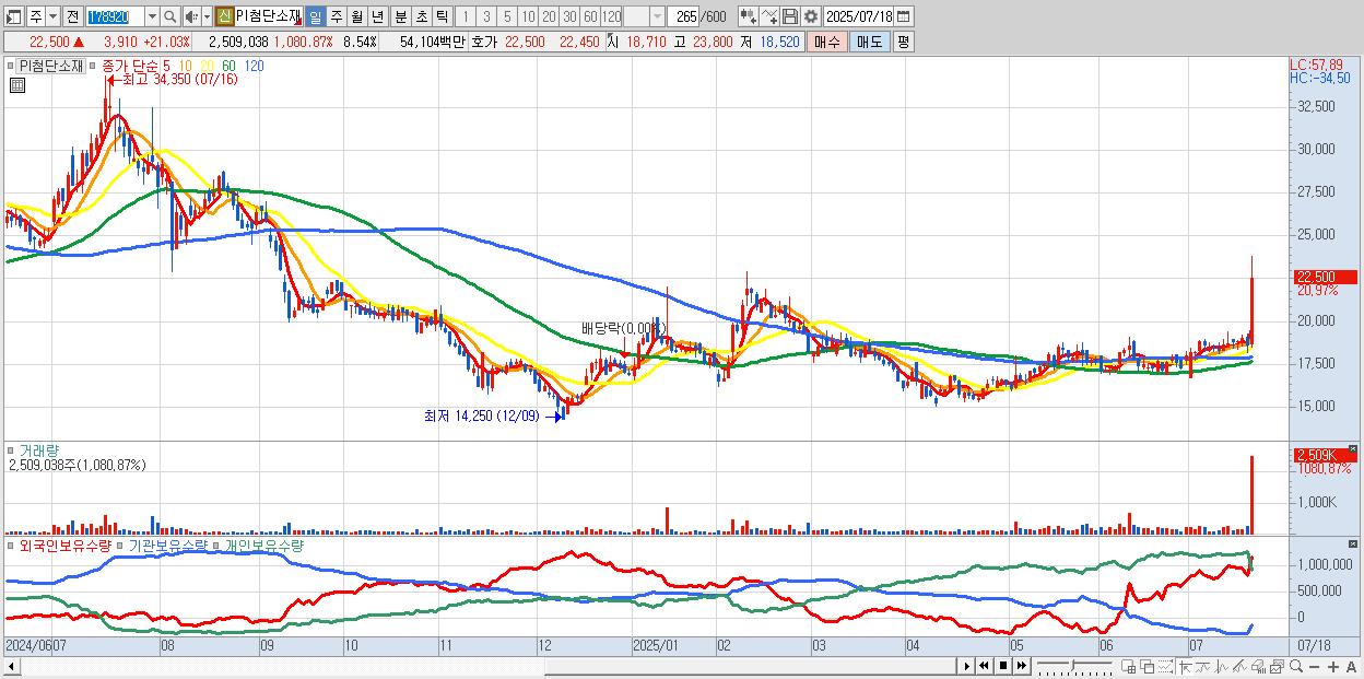 - PI첨단소재 (21,400원 ▲ 15.12% , 시총: 6,284억, 거래량: 1,051,816, 거래대금:218억)