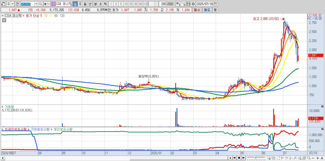 - CSA 코스믹 (1,847원 ▲ 9.16% , 시총: 1,131억, 거래량: 5,173,205, 거래대금:100억)