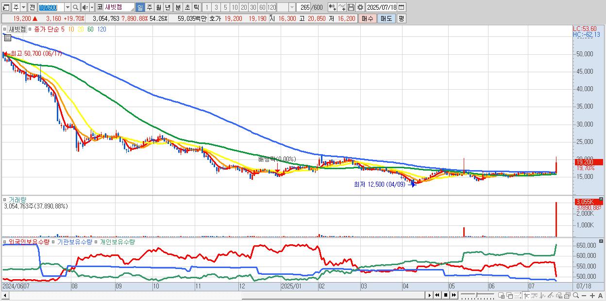 - 새빗켐 (19,200원 ▲ 19.7% , 시총: 1,081억, 거래량: 3,054,763, 거래대금:590억)