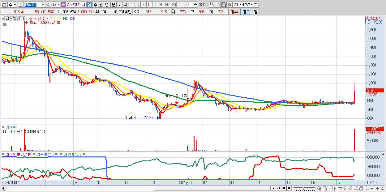 - 삼진엘앤디 (916원 ▲ 19.58% , 시총: 229억, 거래량: 11,006,674, 거래대금:102억)