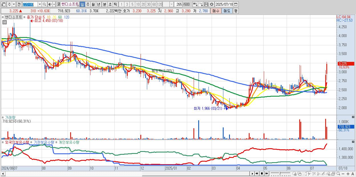 - 핸디소프트 (3,225원 ▲ 10.63% , 시총: 626억, 거래량: 718,923, 거래대금:22억)