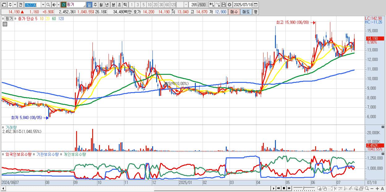 - 핑거 (14,190원 ▲ 8.9% , 시총: 1,329억, 거래량: 2,452,361, 거래대금:345억)