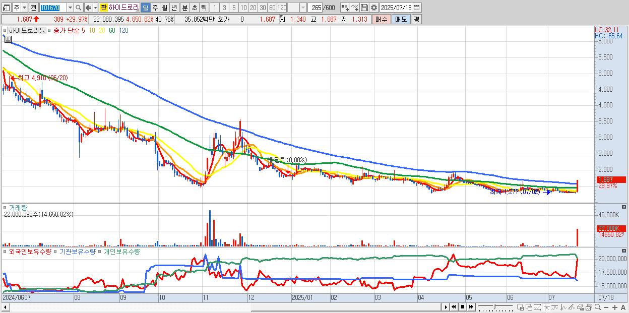 - 하이드로리튬 (1,687원 ▲ 29.97% , 시총: 914억, 거래량: 22,080,395, 거래대금:359억)
