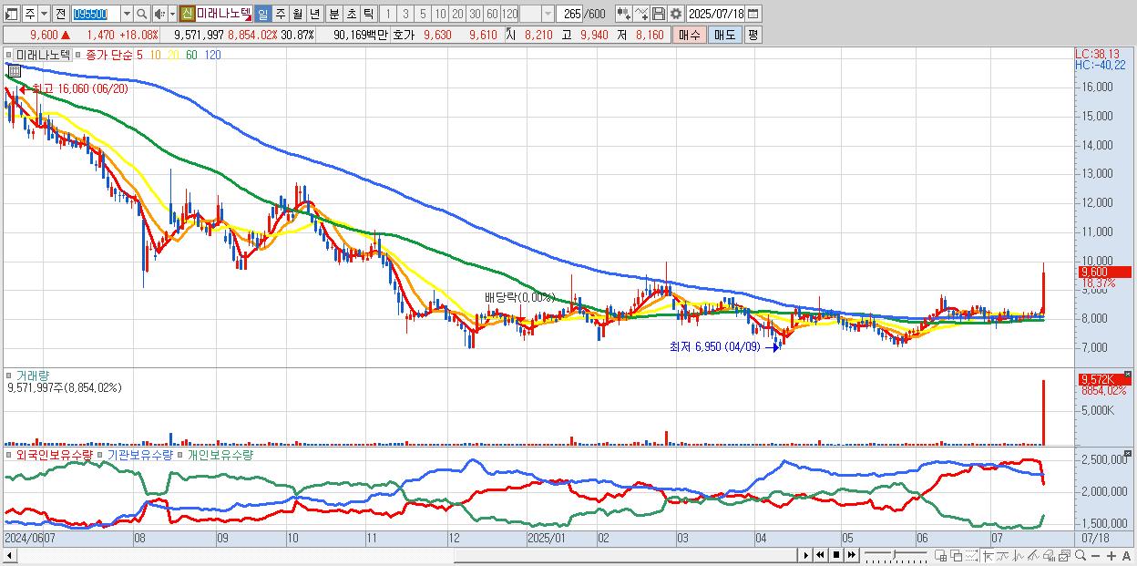 - 미래나노텍 (9,880원 ▲ 21.53% , 시총: 3,064억, 거래량: 4,897,877, 거래대금:459억)