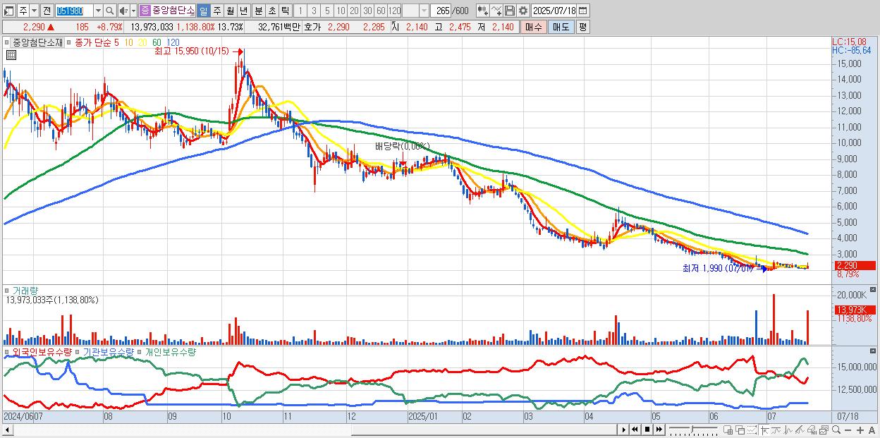 - 중앙첨단소재 (2,290원 ▲ 8.79% , 시총: 2,331억, 거래량: 13,973,033, 거래대금:328억)