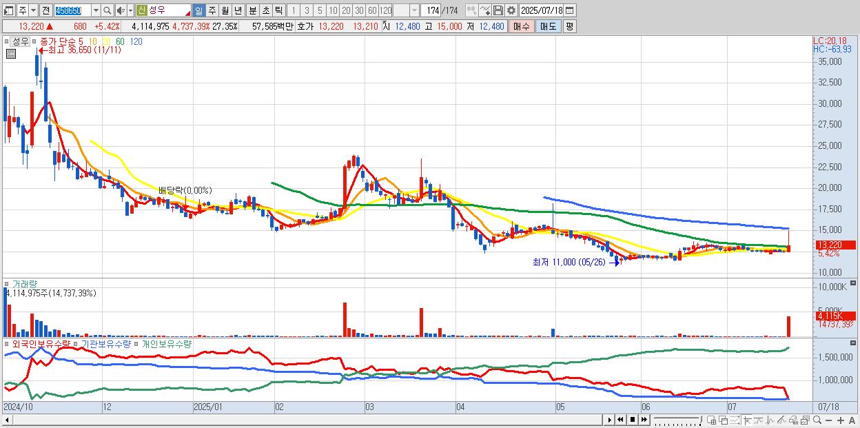 - 성우 (13,800원 ▲ 10.05% , 시총: 2,076억, 거래량: 2,267,953, 거래대금:318억)