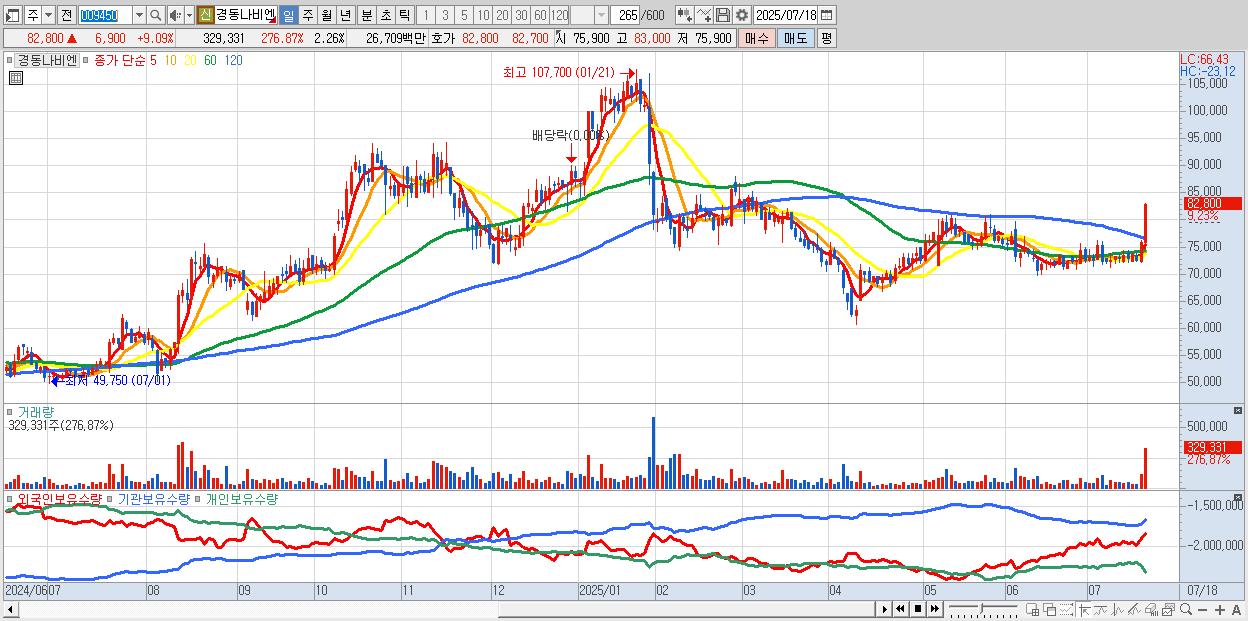 - 경동나비엔 (83,000원 ▲ 9.35% , 시총: 12,092억, 거래량: 238,042, 거래대금:193억)